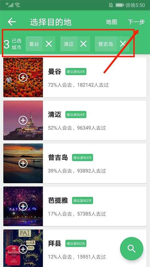 4、勾选好想去的目的地,就会显示已选城市,继续选择右上角“下一步”选项。