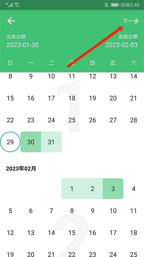 2、开始选择“出发日期”和“返程日期”,然后选择右上角“下一步”选项。