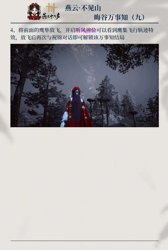 4、将前面的鹰华放飞,开启听风辨位可以看到鹰集飞行轨迹特效,放飞后再次与祝锦对话即可解锁该万事知结局