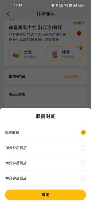 4、在订单页面中正上方有两项功能,用户可以去店面进行就餐,也可以自行去店面取餐,然后点击取餐时间。
