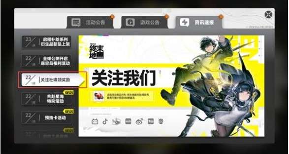 软件提交 专题合集 热门手游明日方舟终末地社媒奖励怎么获取,玩家登录游戏即可在邮箱中获取预约奖励。而在游戏活动页面中,玩家可关注社媒领取丰厚奖励,最高可获取180嵌晶玉。下面就是关于领取社媒奖励的方法,一起来看看吧。