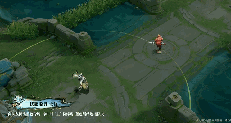 向队友掷出一枚蓝色令牌,拖尾伴随流曳的水墨与符文。命中目标时,“生”符浮现,缠绕金丝的蓝色绳结连接队友。