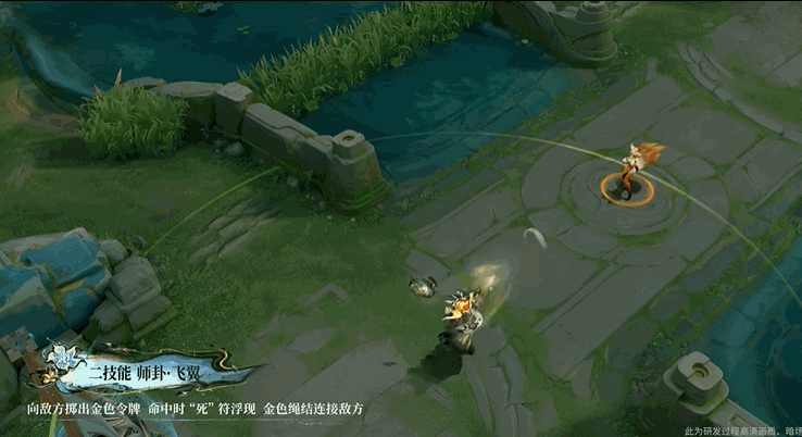 向敌方目标掷出一枚金色令牌,拖尾伴随流曳的水墨与符文。命中目标时,“死”符浮现,缠绕红线的金色绳结连接敌方目标。