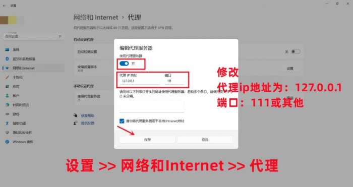 打开电脑 设置>>网络和Internet>>修改代理IP地址为127.0.0.1,端口为111或其他(确保WiFi为连接状态但不可上网即可),点击保存