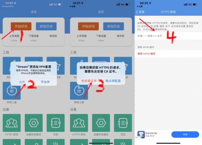 点击 开始抓包-允许-去安装证书-安装CA证书-允许-关闭