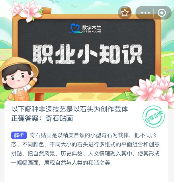 软件提交 专题合集 热门手游以下哪种非遗技艺是以石头为创作载体?【蚂蚁新村每日一题】2025年10月20日题目已发布!坚持答题,积累木兰币,即可加速小镇建设。答对本题,立即可享“产速+3/时”的加速奖励!今天正确答案是【奇石贴画】。奇石贴画是以精美自然的小型奇石为载体,把不同形态、不同颜色、不同大小的石头进行多维式的平面组合和创意拼贴.