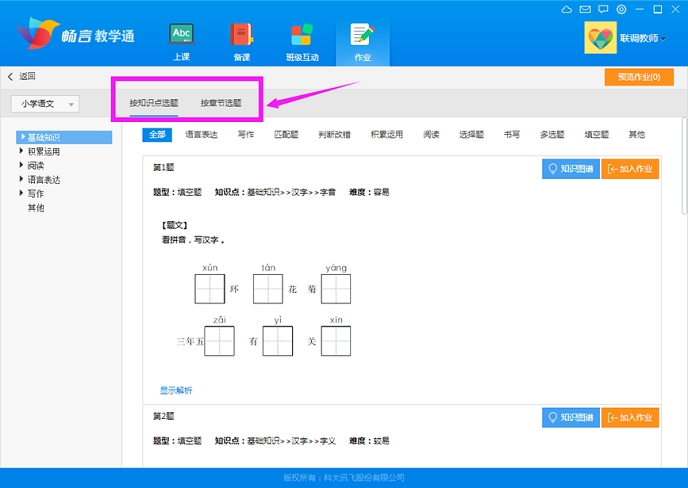 教师可以通过“按知识点选题”或“按章节选题”进行筛选,将合适的题 “加入作业”。