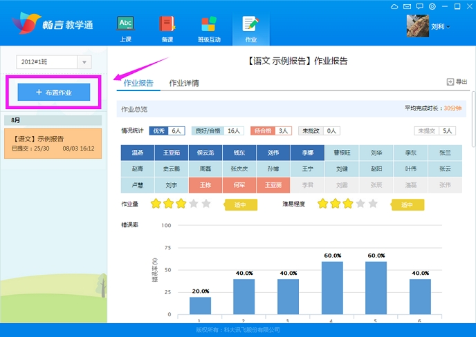 针对每一次作业,系统会生成一份统计报告,学生的整体情况一目了然。有每道题的错误率,班级的答题情况以及每个学生的答题详情。此外,也让老师可以了解学生对作业量和难易程度的反馈。