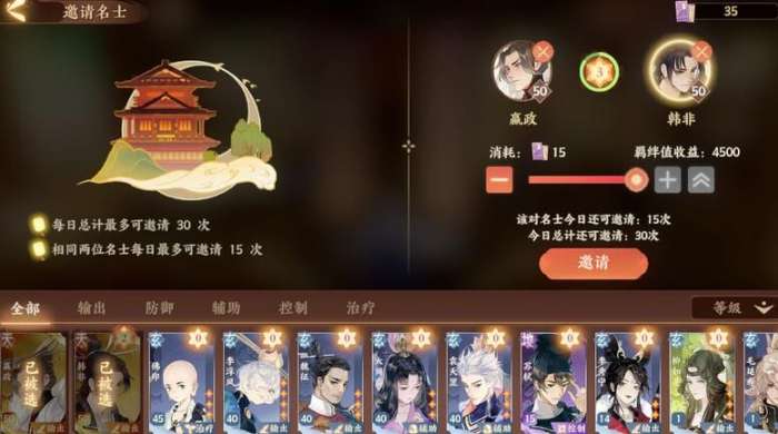左边放上嬴政,右边放上韩非,中间进度条拉满,最后点击邀请即可。