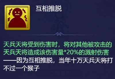 互相推脱:天兵天将受到伤害时,将对其他被攻击的天兵天将造成该伤害量的20%的溅射伤害,根据技能说明来理解的话应该是秒7收益最高,除主怪外每个小怪都能享受到其他五个小怪的20%伤害溅射,就是额外的100%的伤害