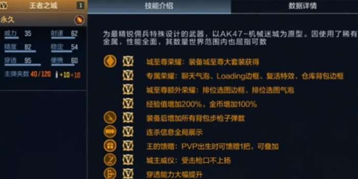 者之城是一款按照AK47-机械迷城为原型制作的皮肤,提升了射速、穿透力、精准度、稳定性,增加了和王者之戮相同的枪口不上扬属性。
