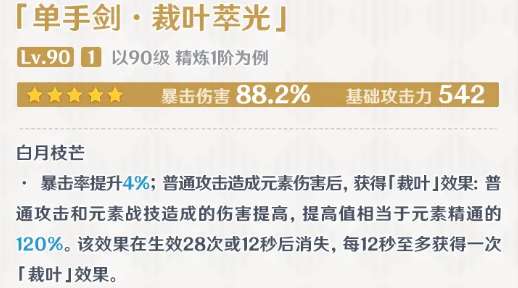 暴击率提升4%;普通攻击造成元素伤害后,获得「裁叶」效果:普通攻击和元素战技造成的伤害提高,提高值相当于元素精通的120%。该效果在生效28次或12秒后消失,每12秒至多获得一次「裁叶」效果。