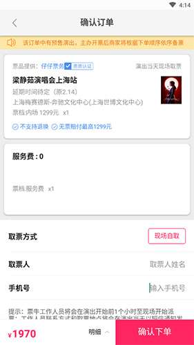 4、确定订单,输入取票人姓名、手机号,然后点击“确定下单”选项。