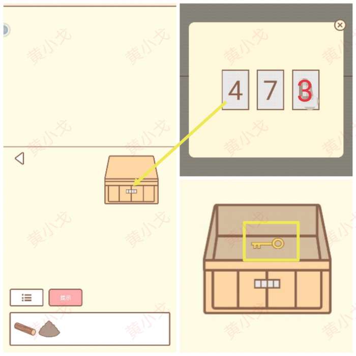 4.(场景4)点击箱子上的密码锁,根据秤出的物品重量,输入密码:473;打开箱子,获得【钥匙】