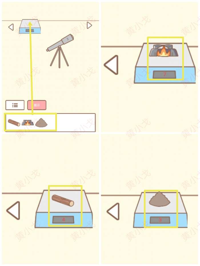 3.(场景3)把【火炉】、【木柴】和【灰色物品】放到秤上秤,获得线索(火炉-7、木柴-4、灰色物品-3)