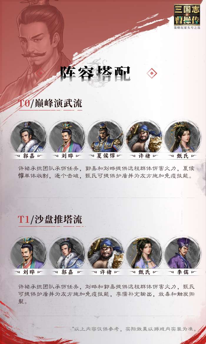 沙盘则围绕 “续航 + 输出” 构建,甄氏稳住生存,刘晔、郭嘉扛起火力大旗,李儒补充输出,放毒和触发撕裂。