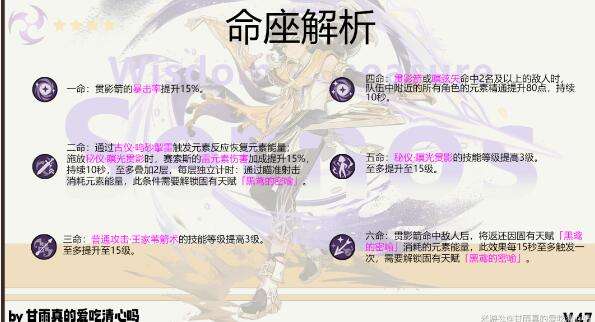 六命:贯影箭命中敌人后返还消耗的元素能量,每15秒触发一次,大家可以根据自己的需求去合理地进行一个资源的搭配。
