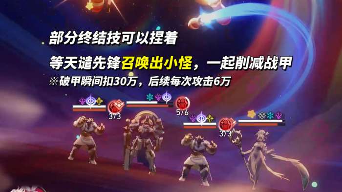 优势属性「冰=雷>量子>其他」,类型推荐「群攻>扩散>弹射」,除第1波承露天人有40%风抗,其余敌方都是正常抗性。 【对敌策略】 第1波:注意天谴先锋的行动位置,它行动时会召唤天谴斗士。建议在等待它召唤后,再开启正式输出,可最大化削减战甲获取额外充能。同时破甲后受击会附带额外伤害,副C、辅助也可一起盯着天谴先锋打,其血量比旁侧承露天人高许多。