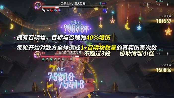 持有召唤物时,自身与召唤物获得40%增伤。每轮开始时,对敌方全体造成“1+召唤物数量”的真实伤害,至多3段,每段伤害7-9万,适合清理召唤物。