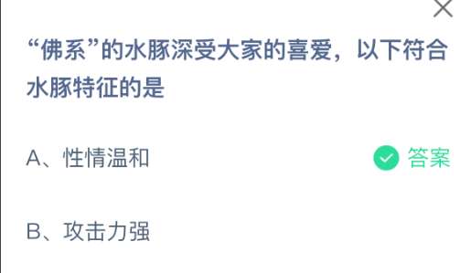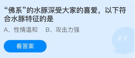 软件提交 专题合集 热门手游“佛系”的水豚深受大家的喜爱,以下符合水豚特征的是?支付宝小鸡课堂开课啦!每天花一分钟答题赚饲料,喂喂小鸡就能贡献爱心啦!轻松又意义十足!2025年10月11日蚂蚁庄园的小鸡课堂题目正确答案是【性情温和】,水豚以其极为温和的脾气著称,几乎不主动与任何动物发生冲突,即便是遭受其他动物的侵扰,它们也会以一种“佛系”的态度应对,不会轻易发怒或反击。