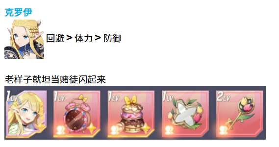 先说克罗伊这个精灵吧。她在队伍里的定位就是一个纯粹的坦克,装备属性的优先级应该是回避最重要,其次是体力,最后才考虑防御。为什么要这样配呢,因为克罗伊的核心玩法就是靠闪避来保命,如果回避堆得够高,她在战斗中就能像赌徒一样频繁触发闪避效果,让敌人的攻击打不中她。体力的话能增加她的生存能力,防御虽然也有用但相对来说没那么关键。