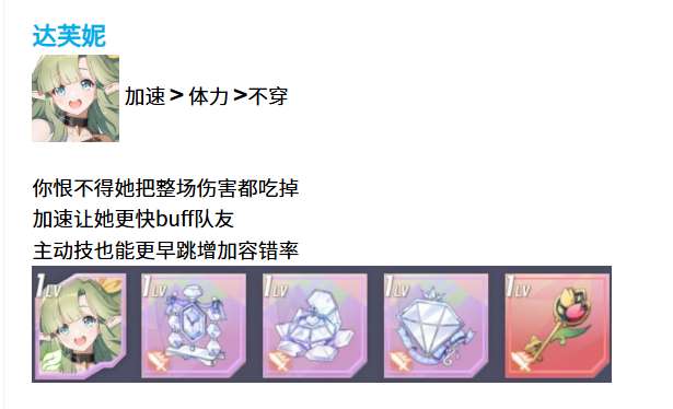 达芙妮这个精灵就更有意思了。她的装备思路是加速第一位,体力第二位,如果实在没有合适的装备甚至可以不穿。听起来好像有点夸张,但确实是这样的。因为达芙妮的作用就是要尽可能多地承受伤害,同时给队友提供增益效果。加速能让她更快地释放技能给队友上buff,而且她的主动技能有跳跃机制,速度快了之后能更早触发跳跃,这样容错率就会提高很多。基本上你就是希望她把整场战斗的伤害都吃下来,保护其他输出型精灵。