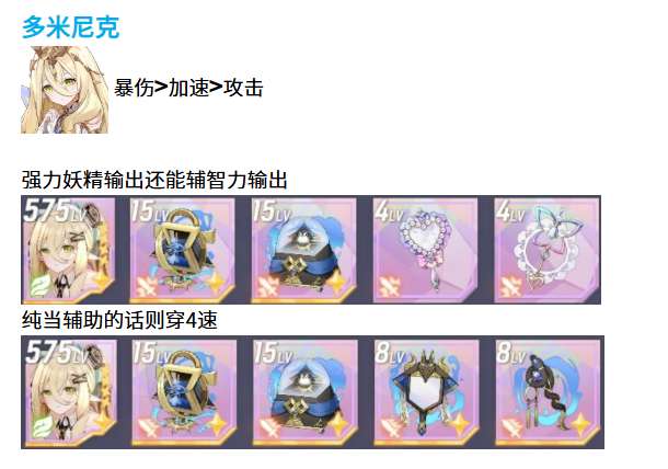 多米尼克是个很强的妖精型输出精灵,她还能辅助智力系的输出角色。配装方面暴伤是第一选择,然后是加速,最后才是攻击属性。不过如果你只是把她当纯辅助来用的话,那就直接给她穿4件加速装备就可以了。这个精灵的灵活性还是挺高的,既能打输出也能做辅助。
