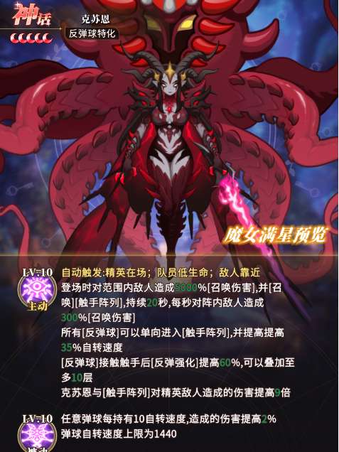 分享的第3个角色是克苏恩,是属于反弹球特化类魔女,他的核心技能在登入场地的时候能够对敌人方造成召唤的损伤,并且能够召唤出触手阵列,战斗当中的全部反弹球,只要进入触手阵列就会迅速提高自转的速度,若反弹球触碰到触手之后,反弹的力量就会增强,他的被动技能能够使随意的弹球,每次保持有10次自转的速度,就会使造成的损伤大大的提高。大型球角色弹球。自转的速度常常为360,反弹球角色弹球自转的速度为720,无论是大型球还是反弹球,克苏恩都能够使弹球的速度提高。