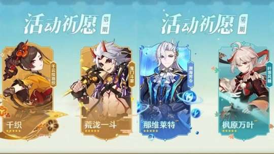 【限定卡池更新】①上半,千织(有乐御簾切)+荒泷一斗(赤角石溃杵);②下半,那维莱特(万世流涌大典)+枫原万叶(苍古自由之誓)。