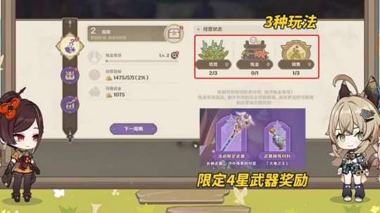 【升炼研巧万策金】4.5版本主活动,经营玩法,需要培育药材、炼药、销售,尽可能多的提升店铺收入。活动期间还可获得限定4星长枪‘沙中伟贤的对答’,长得跟个魔法棒似的,严肃型角色佩戴肯定很有反差感!
