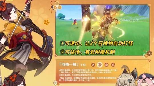 【新角色简报】千织,5星岩元素单手剑角色,速切后台召唤物远程自动输出与前台站场自身岩附魔搭配召唤物一齐输出双玩法。战技类似艾尔海森/刻晴,并生成1个召唤物,场上有其他岩召唤物会额外多召唤1个,且突进结束后可在空中切换队友或自身获得岩附魔。元素爆发则是对前方造成一段斩击。生活天赋,提升队伍的移动速度。