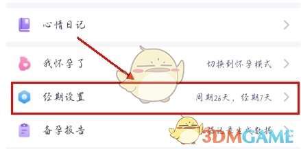 1、操作十分的简单,先找到【经期设置】,点击进入;