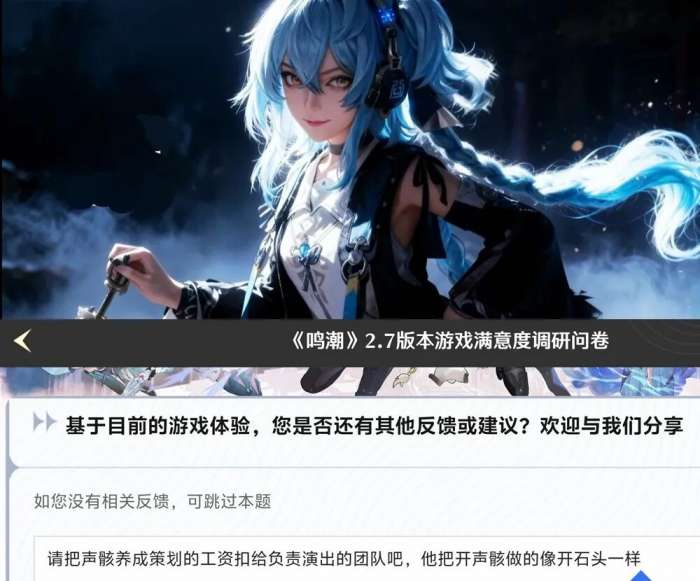 11月初,鸣潮展开了对2.7版本的问卷调研。玩家的反馈依旧活跃,社区很多工单出现,或许是因为库洛一直呈现出听劝的低态,有些玩家向游戏提出的意见,逐渐触及核心,甚至变得不太现实与苛求。
