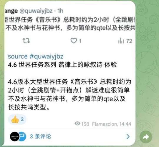 不过好在4.6版本大型世界任务音乐书总耗时为2个小时,但需要全跳剧情,省去开锚点的时间。难度方面不及水神书与花神书,都是一些简单的解谜。个人觉得慢慢做就好了,合理搭配时间即可。