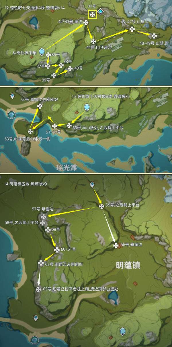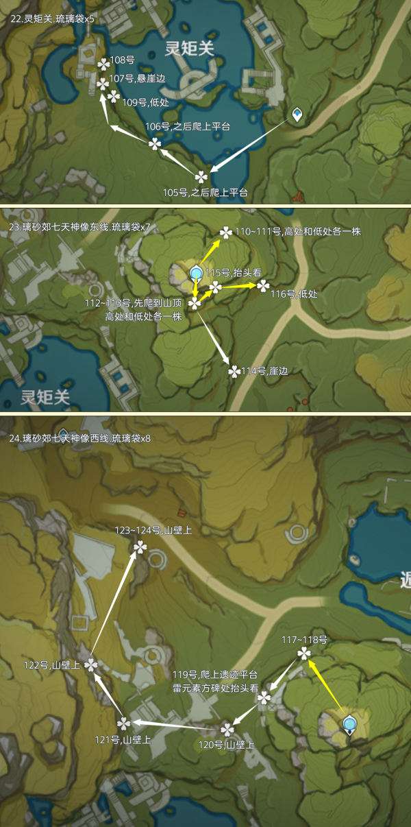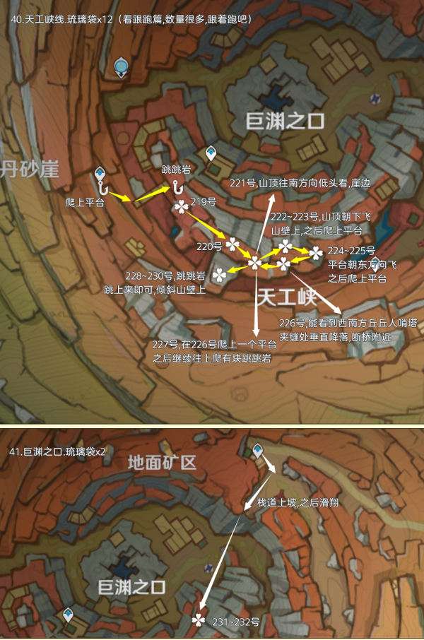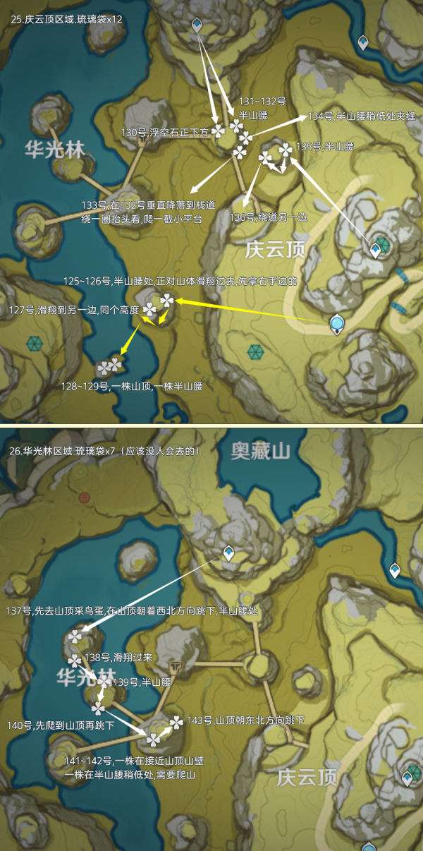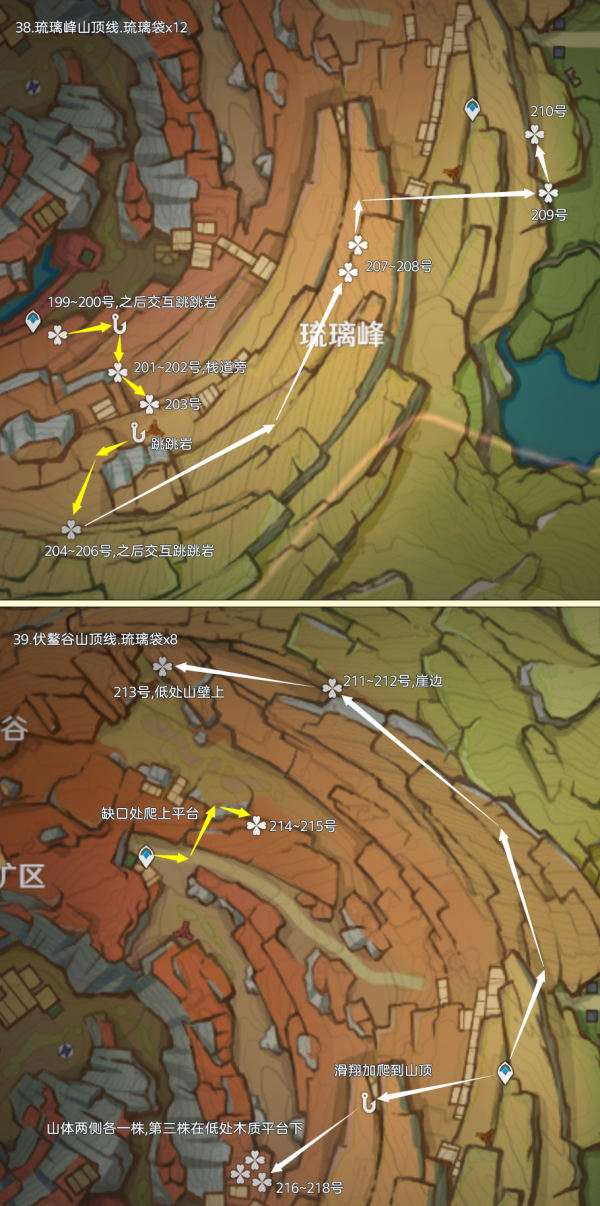 (222~223号)爬上来回到山顶,站在山顶朝着东北方向往下飞,下方山壁上有2株琉璃袋,附近有几只岩史莱姆,方便认路