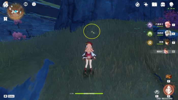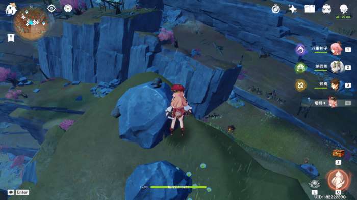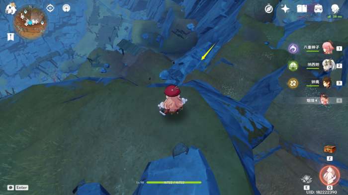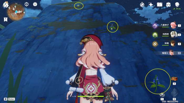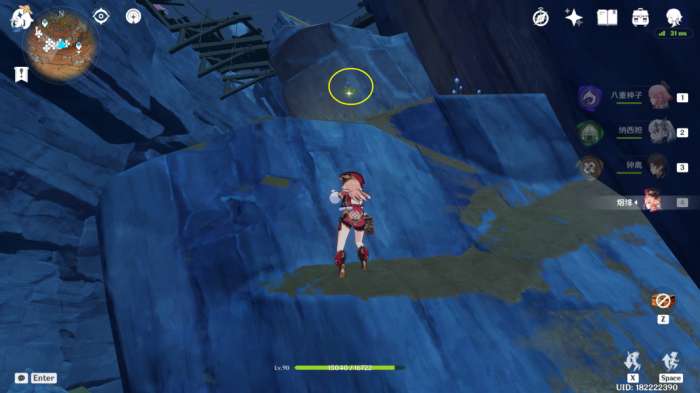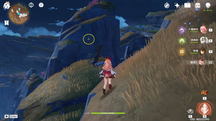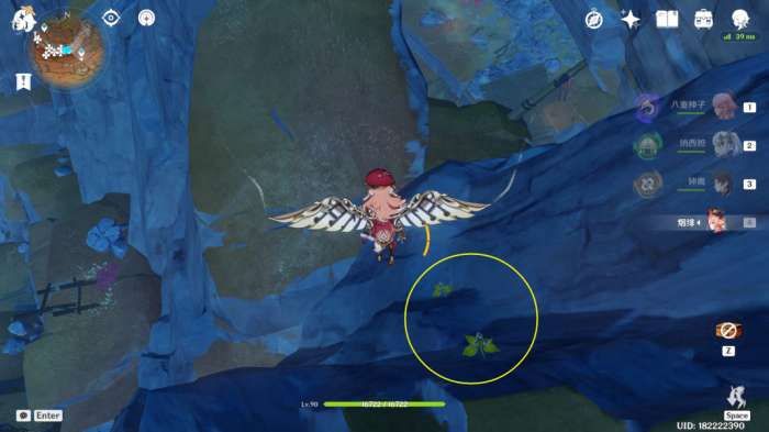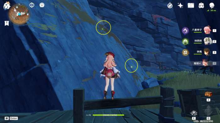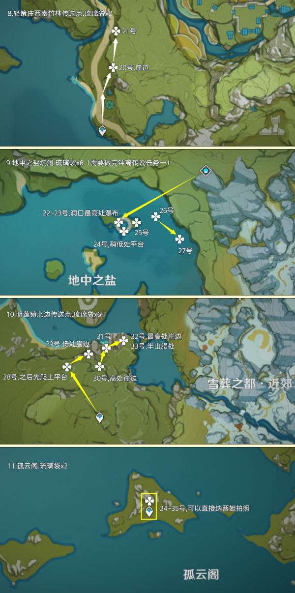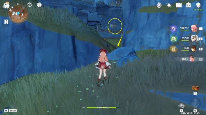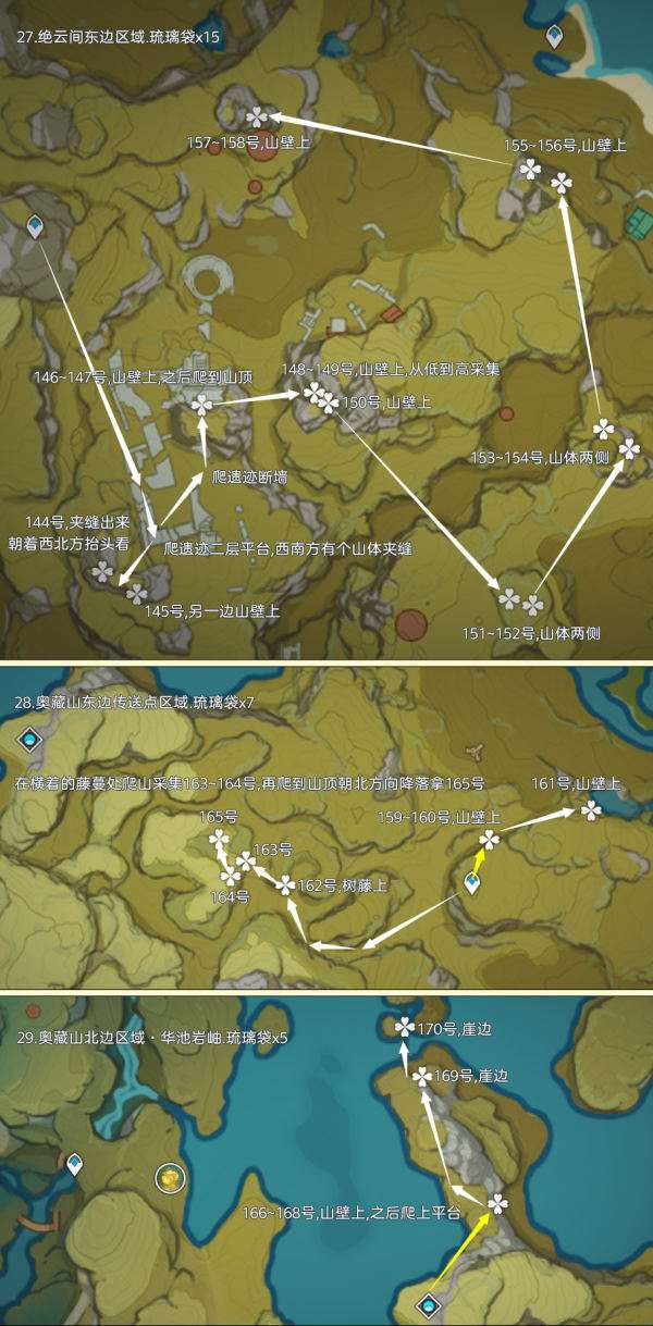 (222~223号)爬上来回到山顶,站在山顶朝着东北方向往下飞,下方山壁上有2株琉璃袋,附近有几只岩史莱姆,方便认路