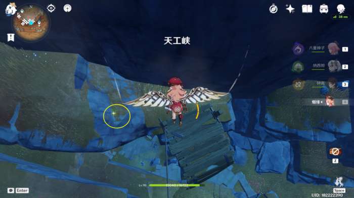 从夹缝处穿过垂直降落,下方断桥附近有1株琉璃袋
