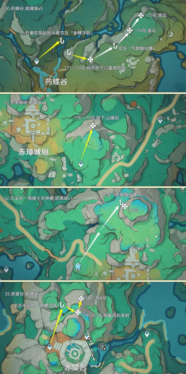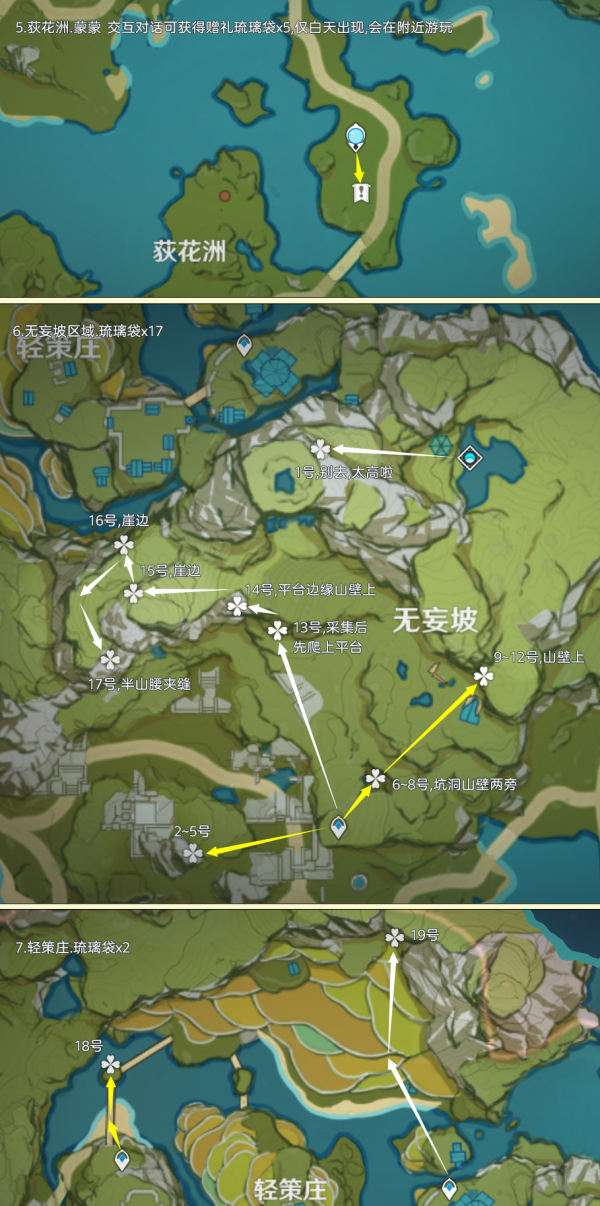 琉璃袋点位分布在璃月区域内,优秀分布点有无妄坡、层岩巨渊七天神像、天工峡和赤望台区域等,其中可重复采集数量为232株;制作路线时尽量遵循从上往下游,视野高好看清,方便旅行者探索。