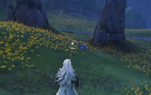 接着玩家可以沿着这个位置继续向右,在右侧就可以看到幻焰灵,这个角色身上会散发着火红色的光芒,在黑暗的环境中非常耀眼,这也是为什么要让玩家把时间调节到晚上的原因,一个是在黑暗中亮眼,另外一个主要原因是,只有在晚上这个精灵才会出现,接着玩家可以沿着这个点位继续向前,看到一条小路之后,就可以往左侧看去,这时候会出现摩托狼这个宠物,玩家可以先走到坡度下方,然后背身进行攻击,这样捕捉起来会比较简单。