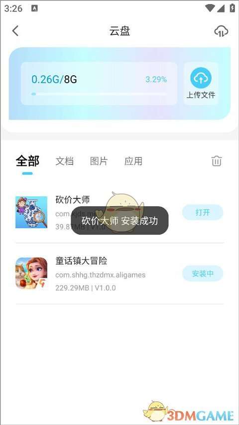 3、进入云盘页面点击上传文件按钮,进入添加文件页面,选择“应用”,勾选本地未安装需上传的APK文件;
