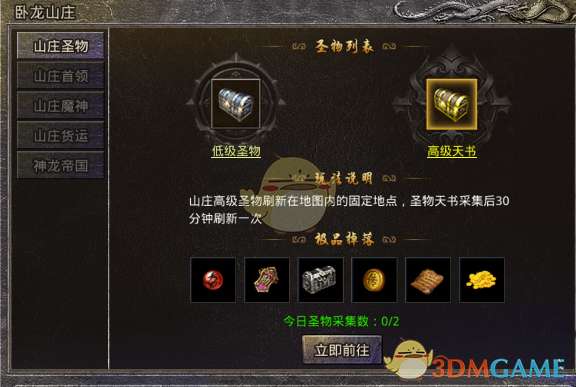 在山庄的“山庄圣物”上可以对散落在地图不同位置的天书进行搜集,低级天书会散落在各个地方,都会不定时刷新。而高级天数则会在地图的五个固定地点刷新,搜集后会出现刷新时间,只要时间到了就能继续获取。收集高级天书都有机会获得五页的技能书页,玩家每天可以收集两次高级天书。