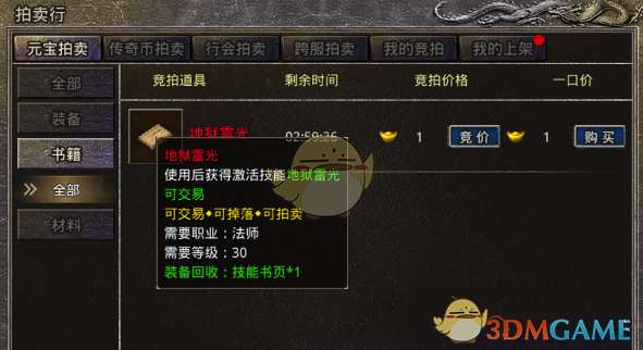 4、在拍卖行里,会有很多玩家拍卖各种装备和材料,东西多种多样,很多比较稀缺的材料、装备和书籍都有可能在拍卖行上找到。玩家可以通过观察拍卖行的“书籍”一栏,观察其他玩家摆在货架上想要卖出去的技能书,可以通过购买或者竞价进行购买。