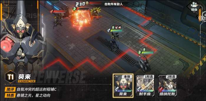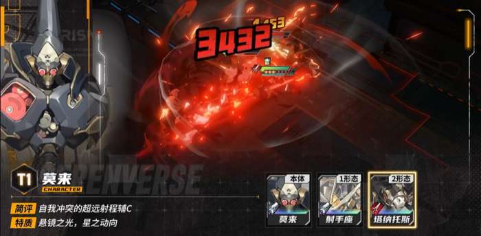莫来,远程输出辅C,固伤占比较高。本体形态有比较高的战斗力,跑图时能走4格,攻击时有3格射程。他在变身时,会临时取消移动和射程增益,手感略难受。
