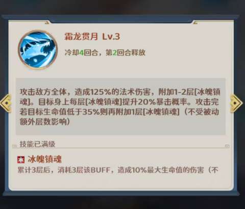 大家使用这个霜龙惯月技能可以更快的累积起来冰魄镇魂需要的状态效果,根据攻击效果来进行判定的话,其实如果当前目标在生命数值低于35%的情况下,给这个敌人还会附加再多一层的冰魄镇魂收益,前期利用第一个技能大概要用三层冰魄镇魂的状态来进行消耗的话,直接用一次这个霜龙惯月就可以将三层全部都累积起来了,当然这里的效果是不受被动额外层数的影响,根据这里的被动效果大家也使用赵云这样的能力时大家也可以注意到,大家也可以快速的将他伤害提升之后,后期能够为他搭配的阵容也是不少的。
