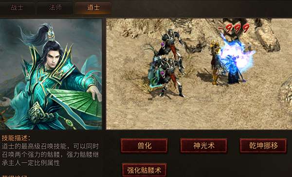(4)兽化:道士的强大状态技能,开启兽化状态,提升宠物攻速和最终伤害,并且提升人物自身大幅最终伤害、生命上限和魔法命中,持续一定时间。