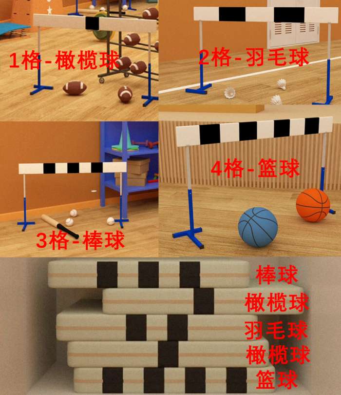 点击排球场后方的跨栏,可以看到另外两种颜色的篮球,记住它们的状态