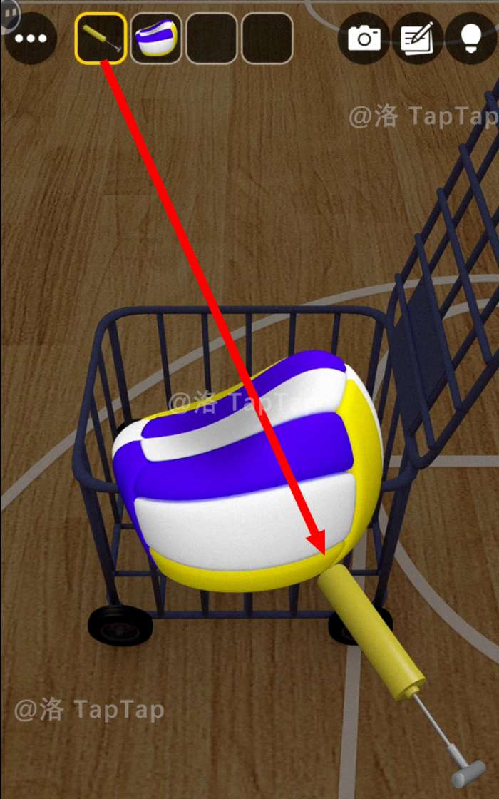 在物品栏中点击【没气的排球】,再点击拿起【打气筒】,点击【没气的排球】为其打气,获得【排球】