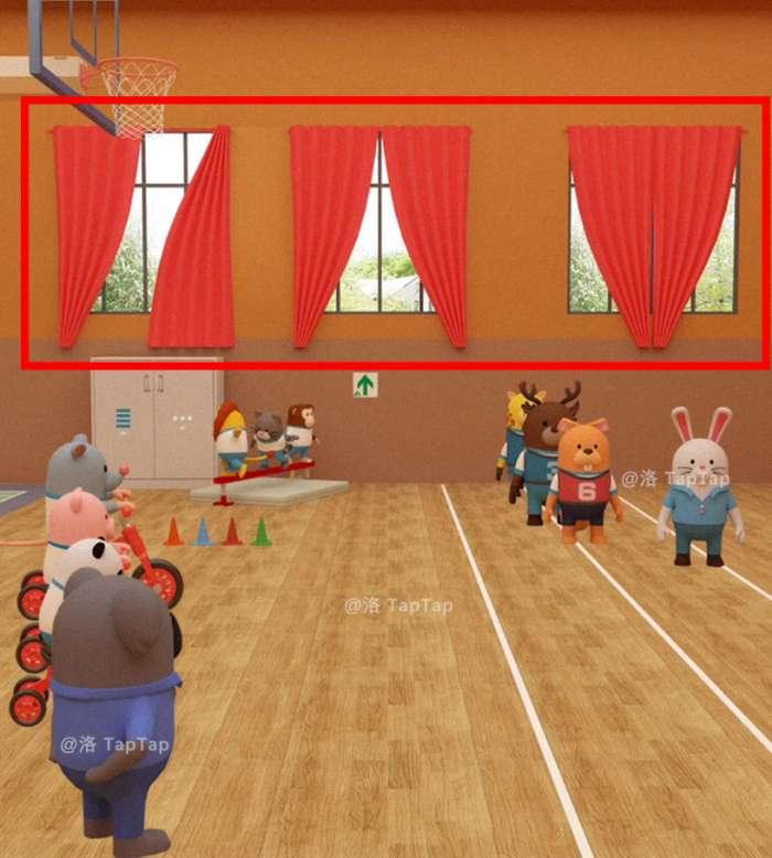 由篮球场后方的门进入田径场,注意后方窗户上窗帘的布局