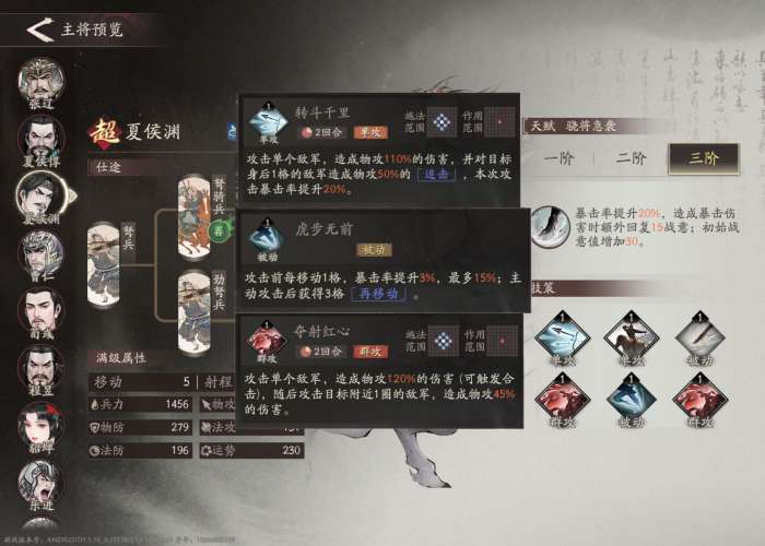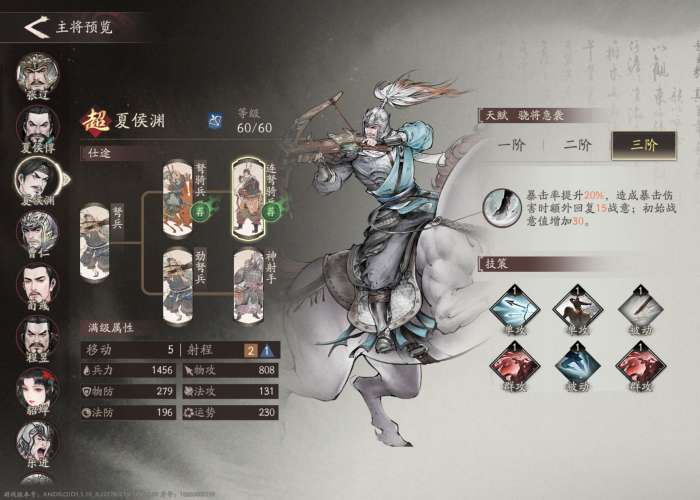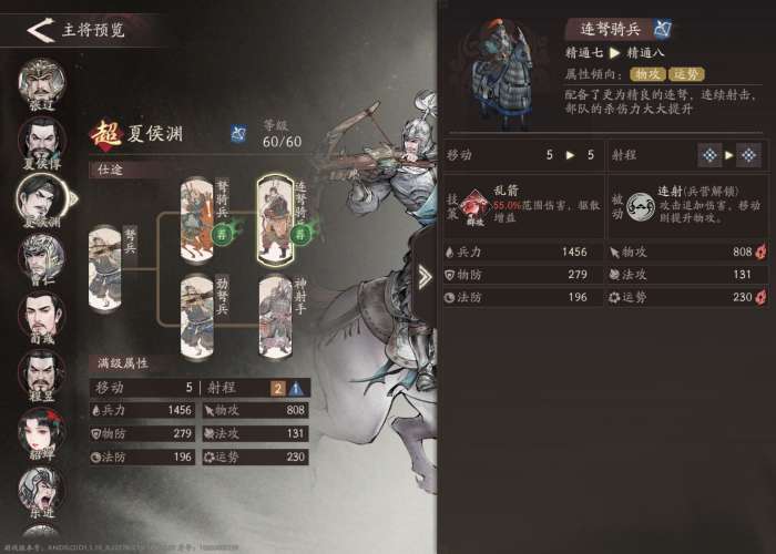分支选择:关于夏侯渊最著名的一句话是“典军校尉夏侯渊,三日五百,六日一千。”在游戏里他的优势兵种也是骑兵。和夏侯惇正相反,注重单体爆发的夏侯渊不需要更大的攻击范围,攻击范围换为移动力对较脆的夏侯渊来说优势更大。