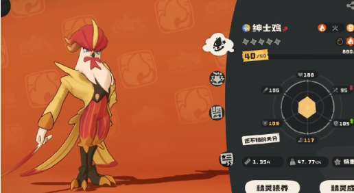冰灵绅士鸡这其实就是一个火属性比较出色的高爆发性输出角色。擅长的是魔法攻击,还有物理攻击,基础的面板中攻击就已经达到106点,生命值也可以达到188点。这起点其实真的一点都不算低,更厉害的是在经过进阶之后就可以达到一个最佳的形态。攻击的数值就可以直接飙升到380点,这伤害能力让大家想想就觉得比较带劲。在战斗的时候始终都是燕尾服的造型,看着比较优雅,而且在打架时也很厉害。